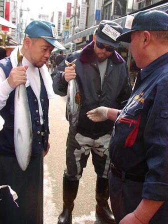 次は魚屋さんへ移動。お店の社長さんから、プロっぽい魚の持ち方を教わるお二人。