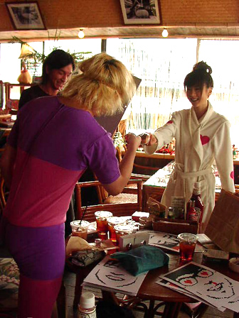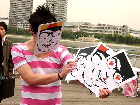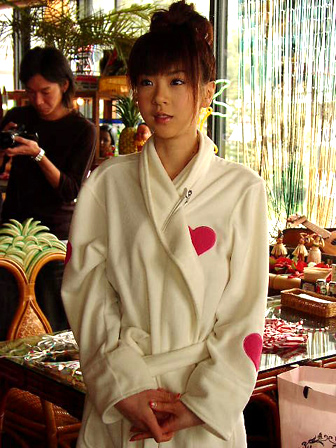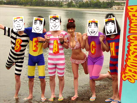 ストライプの水着に着替えたボーカル&ギターのヒダカさん。BEAT CRUSADERS×松たか子(2001年5月)以来2度目の登場!お面も今回の撮影のために<水泳キャップ><目がハート>バージョンと豊富に取り揃えて、気合い入ってます!ほしのさんとの水着共演に期待はふくらむばかり?「下ネタ、大丈夫っすかね」とディレクター箭内さんに相談中?(笑)