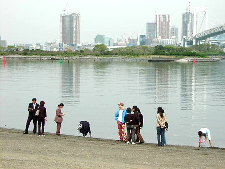 この日はくもり。雨がなんとかもってよかった~!まずは撮影スタッフが都内・お台場海浜公園に集合。修学旅行生やら、波打ち際で潮干狩りをする人たち(!)に混じって、海辺をロケハン。
