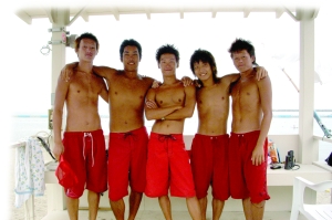 きっかけは2005年の夏、レーベル・スタッフが帰省中に立ち寄った熱海のビーチで偶然流れていた曲の不思議な魅力にやられてしまい、ビーチの関係者に問い合わせたところ、そこで紹介されたのが今回デビューを飾ったTORUMAN(写真中央)。彼はそのとき熱海サンビーチのライフ・セーバーをやっていて、しかも50人ほどの規模のチーム・リーダー。そんな彼の演奏方法というのが、全部のパーツの楽器演奏と歌を自分ひとりでこなしているだけでなく、時には片手でリズムマシーンをリアルタイムで的確に叩き(!)、もう一方の手はピアノでメロディーを奏でて歌う(!!)という独自のスタイルを身に付けているというではないですか! 彼の背景には、Hi-STANDARDなどのパンク的スピリッツ(今作では彼らへのリスペクトの気持ちとして“GROWING UP”をカヴァー)や、スケート・カルチャー~サーフ・カルチャーをとおした等身大のダンス・ミュージックからの影響もかなり感じられます。そして何より宅録ながらも、その演奏は荒削りながら素直で実に開放的な空気感に満ち満ちたものなのです。そこへ、今作のプロデューサーである、あのヤン富田による魔法がそこかしこに散りばめられており、アルバムとしてのストーリー性やドラマティックさが見事に演出されています。さらにアルバム・ラストのヤン富田による“サーフ禅”はスピリチュアル・サーフものの新たな世界として、アンビエントもチルアウトもヨガも癒しも余裕で軽~く超越した11分17秒が広がっています。