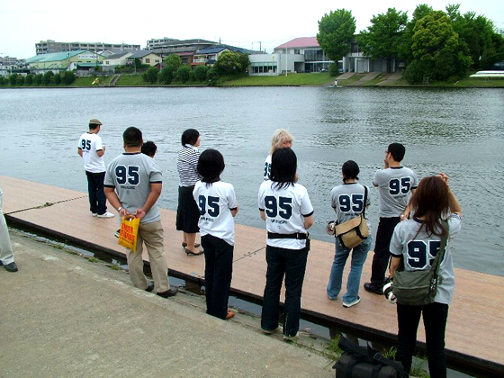今回の撮影場所は埼玉・戸田公園ボートコース。ここは<レガッタ>で知られるボートの聖地!コース両脇には全国の大学の艇庫が立ち並ぶ、自然が多いさわやかな場所です。撮影で使うTシャツをお揃いで着たスタッフがロケハン中~。今回で第95回目の「NO MUSIC, NO LIFE.」ということで「95」!