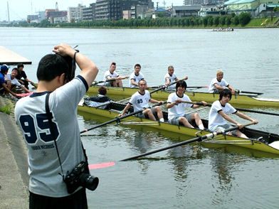 岸から離れないように部員さんがボートの端をおさえながら、カメラマン平間さんが撮影。競技用ボートだけに操縦が難しいのですが、「漕いじゃいけないの?」と残念そうな面々(笑)。