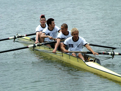 しかし、ハプニング発生!ボートをつかむタイミングが遅れて、陸から離れてしまった両チームのボート!!ボート部員さんたちが「岸に戻れないのでは?」と大慌て!RIP SLYMEの面々は余裕?「さよ~なら~!」とPESさん。現場のパニックぶりに只事でない雰囲気を察しながらも、漂流ハプニングにちょっと楽しそう(笑)?