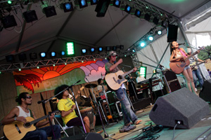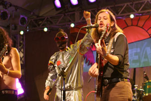 雨上がりのビーチで、異様なエネルギーで観客を惹きつけていたのがデヴェンドラ・バンハート。ヴェティヴァーやエスパーズのメンバーを率いてバンドで登場。謎のマスクマンもいて、狂ったダンスでステージのテンションをアゲていく。途中で演奏できる観客を舞台にあげ、その客の持ち歌を演奏させてセッションするという荒技も披露。とにかく、カエターノ・ヴェローゾのカヴァーも含め、デヴェンドラの歌声に改めて痺れてしまった。*村尾泰郎