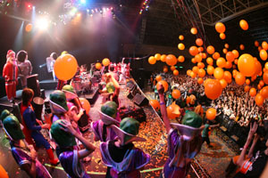 この日、〈SONIC STAGE〉のトリを飾ったのはサマソニ常連バンド、フレーミング・リップス。とにかくリップスのライヴは仕掛けがスゴい。今回もいきなり無数の風船が会場にバラまかれ、さらにウェイン自身が巨大風船に入って、観客に持ち上げられながら移動。ステージに戻ったとたん、“Race For The Prize”で華々しく幕開け。これで盛り上がらないワケがない。舞台上では花吹雪が舞い散るなか、宇宙人のマスクをつけたチアガールと、サンタクロースの集団が曲に合わせてダンス。リップスはといえば、今年はドラマーも加わって、昨年以上にパワフルな演奏を聴かせてくれる。アンコールは“Do You Realize?”で、熱狂のうちにフィナーレ!*村尾泰郎