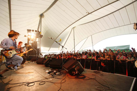 大先輩Zi:LiE=YAの後を受け、MO'SOME TONEBENDERが〈EARTH TENT〉に登場。異常なほどの熱気の高まりのなか、いきなり“ロッキンルーラ”で激しく攻め立てる。なんと椎名林檎もコーラスで飛び入り! 新曲“You are Rock n Roll”やフリクション“BIG-S”のカヴァー、轟音でテントを埋め尽くした“Green & Gold”などの強力ナンバー揃いのなか、ミドルテンポでぐっと聴かせる“Have you ever seen the Stars?”が光っていた。ラストの“hang song”ではマッシヴなベースのループとトランペットが入り乱れ、カオスな盛り上がりに。ライヴ・バンドとしての真価を見せつけてくれた。*鬼頭