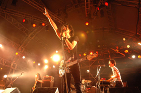 前のライヴが押したため、〈SUN STAGE〉での吉井和哉のライヴは既に終盤。どうやら〈YOSHII LOVINSON〉時代の“TALI”や本名でリリースした“BEAUTIFUL”、そしてニュー・アルバム『39108』からの曲も歌ったと聞いて非常に悔しく思うが、突如THE YELLOW MONKEYの“LOVE LOVE SHOW”が始まった。熱っぽく、誠実に、またいやらしく歌い上げる吉井。しかもギタリストは盟友の菊地英昭だ。THE YELLOW MONKEYは〈RISING SUN〉への出演を菊地の病気でキャンセルした経緯があるが、それ以降に積み重なった思いのたけをぶつけるような、清々しい演奏だった。最後は「6年前にやるつもりだった曲です」という“バラ色の日々”で締めくくる。吉井の顔は、とても晴れやかだった。*鬼頭