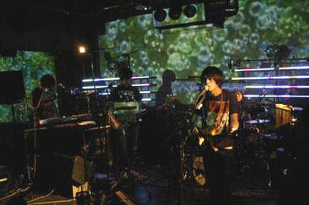 1曲目は歌モノ回帰したアルバムを象徴する先行シングル“Breezin'”。堀江博久によるエフェクティヴなシンセサイザーで幕を開けると、曲が進むにつれ、ドラマーのあらきゆうこが4本の手足で完全にバラバラのリズムを刻みながら、清水ひろたかのベースと絡みあい、じわじわと未体験ゾーンへと聴き手を誘う。それぞれのメンバーの脇にはウィンドチャイムが設置されていて、曲中のブレイクやエンディングでさらさらきらきらした音を鳴らしていた。このさらさらきらきらした音は今回のアルバムを象徴するものだという。
