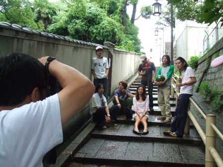 しかし、夢のような時間はそうそう長くは続かないもの、金澤君登場でさっそく撮影開始。まずは先ほどの坂道へ。平間さんの指示でSHIHOさんを全員で見つめた後にカメラ目線! 全員テレまくり(笑) 「目がおうてもた!」(また森寺君談)現場は大騒ぎです。