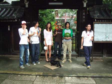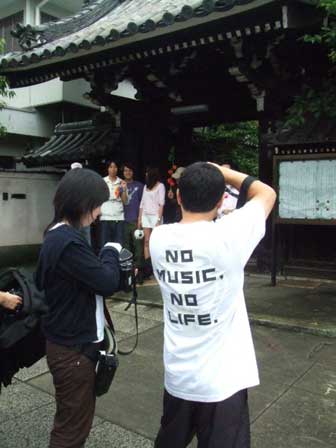 次は坂の途中のお寺の門で。この時点で次松君ビール(多分)5本目! 緊張のあまりビールを朝から手放せずか?