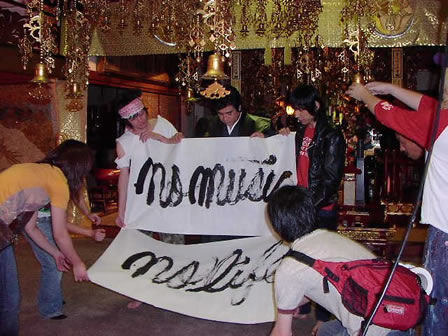 ここでさっきの藤岡さんの“書”が登場! 3人がかりで作品を持ちながら撮影。