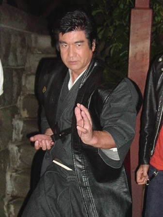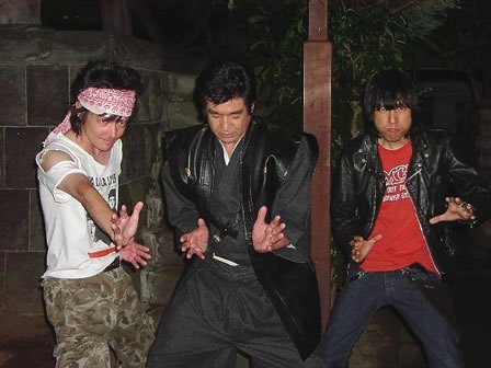 次はお寺の外へ。鐘の近くで、藤岡さんから武術の型を教えてもらうザ・クロマニヨンズの面々。“気”をためて、身体にある“正中線”上に重心を置くことが大事らしいです! ザ・クロマニヨンズのお二人は、初代・仮面ライダーとしても知られる藤岡さんと一緒に戦闘ポーズを決めるのも夢だったようです。段々コツをつかんできたヒロトさんとマーシーさん、なんだかエスカレートしておかしなポーズ&表情に(笑)!