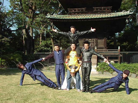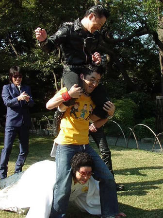 次はバイト君が破壊さんを肩車。それをまた肩車しようと港さんが脚の間から頭を出しておかしなポーズに。全員で扇型に広がって、組み体操!「レモンスライス!」最後は、ついに港さんが2人を肩車しちゃいました!
