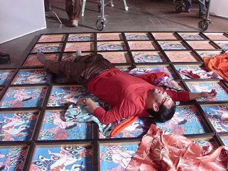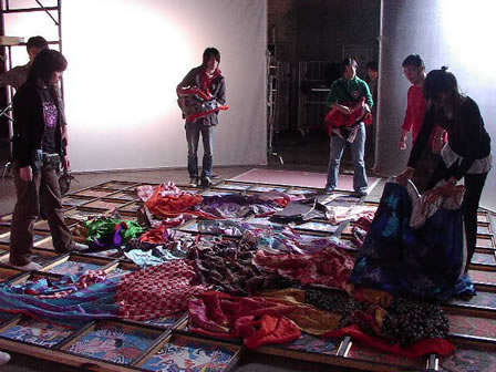 撮影に使う<天井>のセットを準備中。一枚一枚に龍や鳳凰などの絵が描かれた華やかな天井のセット! カメラマン平間さんが寝心地をチェックして「結構痛いかも?」。スタッフが次々と着物を投げて、自然な感じで着物をふんだんに敷き詰めていきます。う~ん贅沢! 撮影のときは皆さんにここに寝ていただきます。
