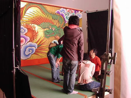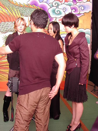 最初のカットは、青龍が描かれた<金屏風>のセットで。土屋さん、蜷川さん、椎名さんの女性陣が登場! 元々、蜷川さんは土屋さん、椎名さんとプライベートで親交があったそうです。とくに蜷川さん&土屋さんは10年前からの長いつきあいなのだとか・・・!