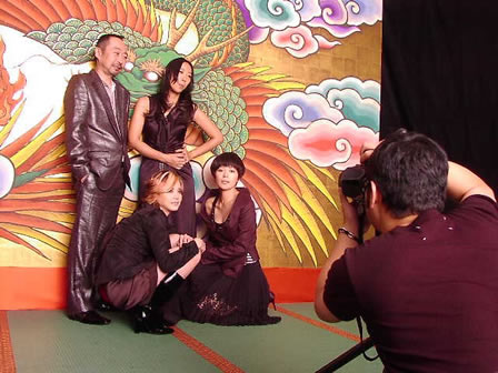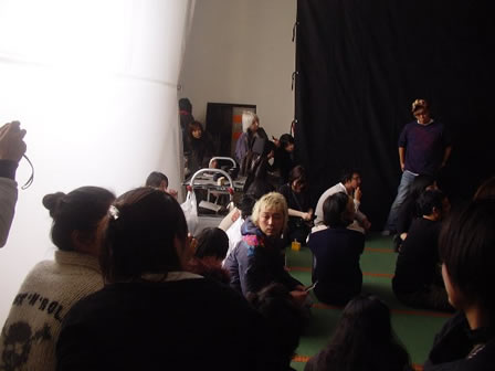 ポーズを変えて撮影は続きます。皆でカメラに向かってピースするシーンも。金屏風のセットは、スクリーンに囲まれ、その中に撮影を見守る関係者が大勢!