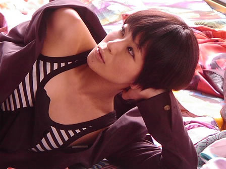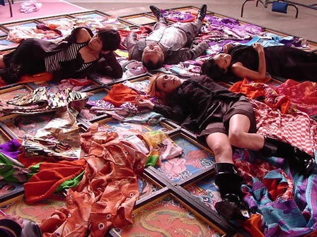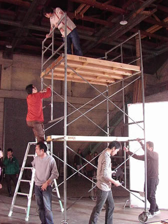次は<天井>のセットへ移動。平間さんが台に上って、上から撮影します。本番は、修学旅行風になるわけもなく、まさに豪華絢爛な図!! 雰囲気に色気がある椎名さん。