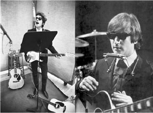 アコギにハーモニカ・ホルダーでディラン化したジョン・レノンの写真は、ビートルズのメンバーが使用した楽器を時代ごとにヴィジュアルで追ったアンディ・バビアックの名著『Beatles Gear』(Backbeat)より