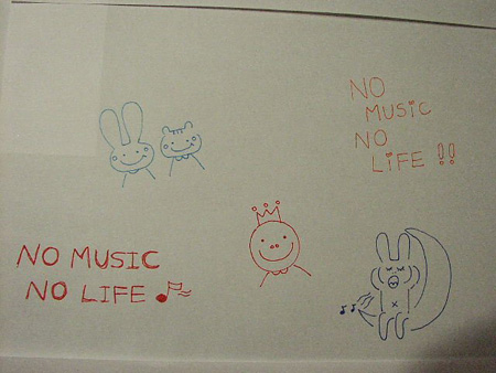撮影後に、谷村さんが得意のイラストを披露。ほんとは高校生の谷村さん、女子高生っぽい感じで、かわいいキャラクターやロゴを一生懸命描いてくれました~。その数、なんと紙8枚分! 田中さんもギターのイラストを披露。これらは「NO MUSIC, NO LIFE.」雑誌広告に登場しているのでチェック! 緊張しながらもフレッシュな感じのコラボとなったお二人の撮影でした! みなさま、おつかれさまでした。