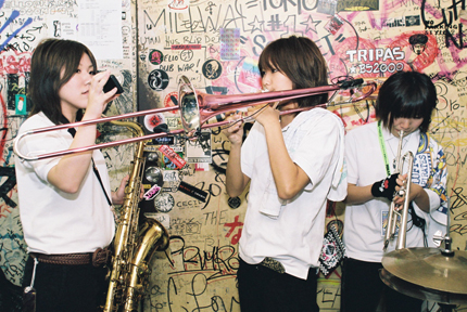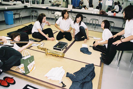 ライヴ活動再開後、一発目のライヴだけに念入りに楽器をチェックするホーン隊の面々。