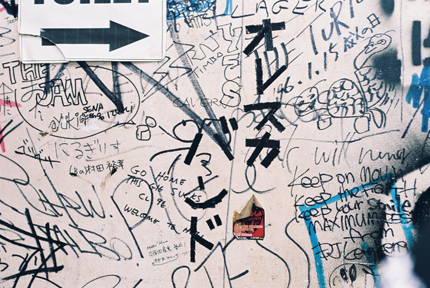ライヴ活動再開を記念して、会場だった心斎橋Club Quattroの楽屋に刻まれた〈オレスカバンド〉の文字。
