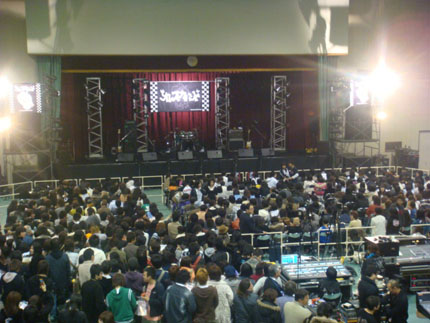 どこかのライヴハウスみたいに見えますが、これは〈堺市立月洲中学校体育館〉のステージです。