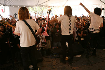 夕方には、JETRO主催の〈MATSURI-JAPAN BASH PARTY 2007〉に出演。アメリカでの初のパフォーマンスを行い、オレスカバンドをまったく知らないオーディエンスのハートを見事にキャッチ☆ 業界人たちが集まるフェスティヴァルとは思えないほどのピースやジャンプで、大いに盛り上がる。