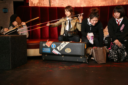 ロスアンジェルス、〈Knitting Factory〉でリハーサルの順番を待つ、いかす、リーダー、もりこ、サキ。