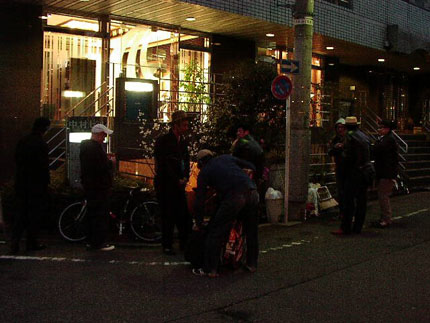 日が暮れて、お店の前に続々と集まってくる出演者&関係者の皆さん。この日飛び入り参加が決まったアーティストも含めると、総勢21人!
