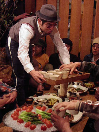 座敷にズラリと並んだ美味しそうな料理を前に、いよいよ撮影がスタート! ハイハイ、お酒が配られますよ~。