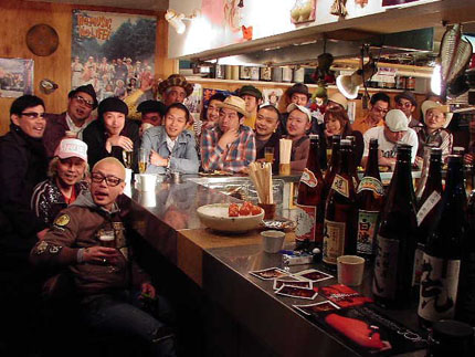 カウンターの方に移動して撮影。すでに酔っ払った大川さんに拉致されて、箭内さんもなぜか被写体側に(笑)。「確認しなきゃいけないんですよ~」とディレクターらしい説明もむなしく、横で〈目つぶし〉!