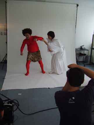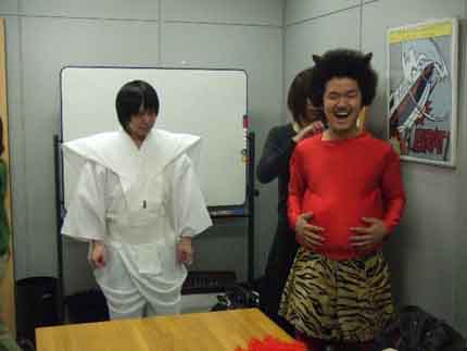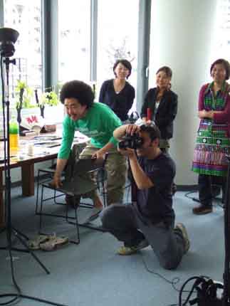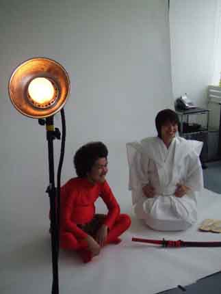 後半戦は、撮影に参加できなかった〈レキシ〉のメンバーの合成の為の撮影。その初日。出演は〈うんち鬼(SCOOBIE DO・岡本“MOBY”タクヤ)〉と〈切腹さん(スネオヘアー)〉。先日撮影の写真を見ながら池田監督? がポーズを決めていきます。