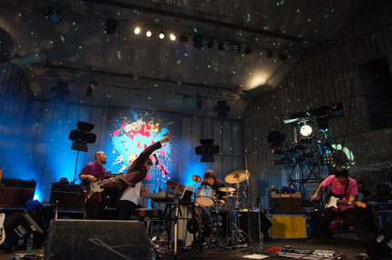 新曲も6曲ほど披露。“YUKATA”“DARUMA”“NABE & SADA”(すべて仮題かと思うが)……どことなくスペーシーな雰囲気を感じさせる曲だった……ような気がするが、それはもしかして、聴いていた僕らが酩酊していたせい? とにかく僕らオトナはしこたま呑んでいた。リカーの力がなくてもハイになれるキッズたちをうらやましく思いながら、そのグルーヴにまんまとノセられて呑まされた。気持ちいい。後半、博多祇園山笠で言うところの〈追い山〉的流れ――“CRAZY DAYS CRAZY FEELING”“COLD BEAT”“FRIDAY NIGHT”“RIFF MAN”――は、初体験でもなかったんだけれど圧倒された。吉田一郎も頼もしいプレイを聴かせてくれたし、新作の制作にも入るそうだし、まだまだこのバンドにはとんでもないものを見せてもらえそうだ……なんて思いながら、アンコール前にもう一回、冷たいビールを買いに行く。