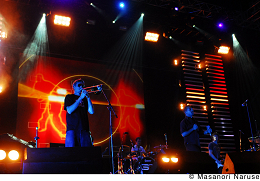 なんと今年は80本以上のフェスティヴァルに出演するというグルーヴ・アルマダは、それも納得の正に〈お祭り向け〉の楽しいパフォーマンスを披露してくれた。今回の彼らは、メンバー2人によるDJセットではなく、10人近くの生バンドを従えた完全フェス対応のライヴ・セット。ヴォーカリストは合計で3人も登場し、曲ごとに彼らが入れ替わり立ち代わり登場する展開は、なんとも賑やかなものだった。また、最近流行のいわゆるインディ/ダンス・クロスオーヴァーものの縦ノリのゴツゴツしたビートとは違い、しなやかで黒っぽくファンキーな彼らのビートは、人を選ばず踊らせることができるものだと改めて実感。クラブ・アクトらしくVJにも力を入れており、見ても聴いても楽しいライヴ・ステージは、ビッグ・アクトならではのエンターテイメント魂が爆発したゴージャスにして煌びやかなものだった。*小林