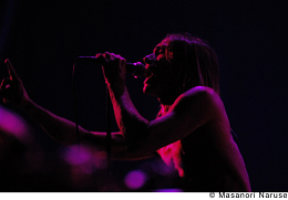いい感じに日も暮れ、ほのかに涼しい風がふきはじめた〈GREEN STAGE〉に、ひときわアツい男が現れた。イギー・ポップだ! 演奏が始まる前から、溢れるエナジーを持て余すように飛び跳ねる半裸の還暦オヤジ。その身体には1ミリの贅肉もない。カッコよすぎ! “Loose”“Down On The Street”“1969”と、お馴染みの名曲が続き、観客は早くも興奮状態。それに応えるようにイギーも、暴れまくったり、舞台から降りてくれたり、戻ろうとしてマジ転びしたり(!)、とにかく一瞬たりとも飽きさせないのだ。ハイライトは“No Fun”。イギーが「カモ~ン!!」と呼びかけるや、舞台上に乱入する客、ざっと100人超。いくら何でも多すぎだろ(笑)! イギー本人もさすがに驚いたようだったが、それでもちゃんと最後まで歌い続けてくれたのは天晴れ。その後もライヴは続き、なんとアンコールにも応えてくれるというサービスっぷりに、お腹いっぱいになった110分だった。*小田