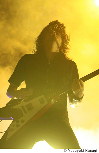 早い時間での登場だったにも関わらず、見事な客の入り。それに触発されたのか、最初の方こそ軽い肩慣らしといった様子だったが、次第に本調子の演奏へと突入していった。ツイン・ドラム+パーカッションが生み出すヘヴィかつ躍動感溢れるビート、ノイズすれすれの轟音で下腹を抉るギター、そして怒号のようなニック・オファーのヴォーカル。その全てがメーターを振り切ったようなテンションで鳴らされているにも関わらず、音の緩急がハッキリとしたアレンジのせいか、以前とは違い、メリハリや躍動感を強く感じさせるようになっていた。また、ステージの端から端まで踊り歩いて観客を煽るニックのエンターテイナーぶりが、彼らのライヴにその音楽性以上の取っつき易さを与えていたのも確かだろう。ハードコア出身ならではの激しさは相変わらずだったが、以前と較べ圧倒的に開放感が増した彼らのライヴからは、〈GREEN STAGE〉に相応しいスケールの大きさが感じられた。*小林