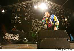 最終日深夜の〈新人ステージ〉前……とは思えないほどのオーディエンスがひしめき合う中、鳴り渡るサタニックなへヴィ・メタル。上半身裸の吉野が客席に酒を吹きかけるのを合図に、横浜発の1MC&1DJ、サ上とロ吉のステージがスタートした。2枚使いで聴かせるイントロダクション、そしてパーリー狂いの夜遊び賛歌“LET'S GO 遊ぼうZE”。ピカソっぽいキュビズム柄のブルゾンという、いつにもましてヤバい服でキメた上野が、百戦錬磨のマイクさばきでフジロッカーを大胆にコントロール。“バウンス・祭”では〈THE PALACE OF WONDER〉中の客が垂直ジャンプで揺れまくる。TARO SOULとDEEP SAWERの横浜クルーも客演で大いに盛り上げ、“ヨコハマジョーカー”“Bay Dream ~フロム課外授業~”のアンセム2連発でちょっとウルッとくるほどの感動的な締め。ヒップホップ・アクトにとってはアウェーに思えるフジロックも、彼らにかかれば完全にホーム・グラウンド。集結したファンのあり余る期待に余裕で応える、貫禄たっぷりのステージングだった。来年はマジで〈GREEN STAGE〉登場!? *澤田