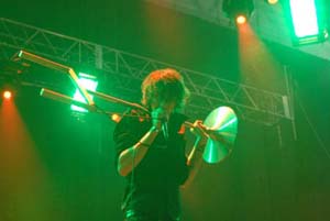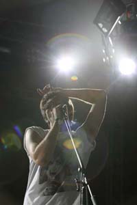 この日、〈SONIC STAGE〉のトリを飾ったのがトラヴィス。客電が落ちると場内に高らかに“ロッキーのテーマ”が響き渡り、騒然とする観客の間を縫って、ボクサーのようなガウンに身を包んだメンバーが登場。そのトラヴィスのイメージからかけ離れた派手な登場シーンに観客は大喜び。オープニングでしっかり観客の心を掴んだバンドは、満面の笑顔でライヴをスタートさせた。アルバムではマジメでナイーヴな印象が強いトラヴィスだが、ステージは元気一杯で、曲のアレンジもパワフル。ヴォーカルのフラン・ヒーリィはカタコトの日本語も交えて積極的に観客とコミニケーションをとり、ドラム・セットに登ってジャンプをキメたり、観客にミネラルウォーターのペットボトルを振る舞ったりとサービス精神もたっぷり。新曲+ベスト的な選曲で、アンコールではサポート・メンバーも含めて5人で肩を組み“Flowers In The Wndow”を熱唱するなど、ピースフルな熱気に包まれたステージだった。*村尾
