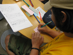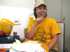 セレクションが決まったら、今度はいよいよ〈手描きPOP〉の作成! サインペンを手に、するすると書き上げていきます。最後に描かれるスマイル・マーク風の〈曽我部マーク〉がかわいい。