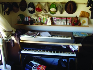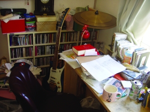 青いギターも借り物です。今回のバンドのアルバムの僕の曲は全部ギターで作曲しました。机は作詩のときと踏切次第を書くときに使うくらいで、あとは都合のいい物置です。