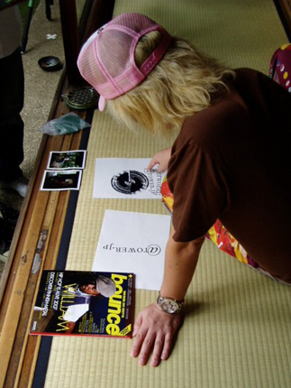 今回のポスターに入る〈@TOWER.JP〉ロゴを見ながら、撮影イメージを広げる箭内さん。このロゴは、なんと世界的デザイン集団・TOMATOに参加するアンダーワールドがデザインしてくれたオリジナルロゴなのです!!!