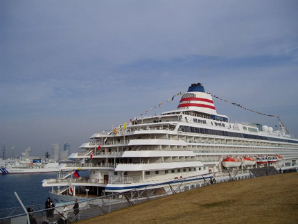 後ろに見える横浜港には、ただいま豪華客船「飛鳥II」が停泊中。日本最大クラスの客船で、400室の客室、ショッピングエリア、カジノ、スパ、ミニテニスコートなどもあるとか!