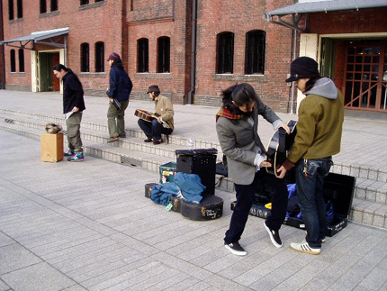 SPECIAL OTHERS(以下、スペアザ)のメンバーが到着。スペアザはインディーズ時代にデビュー・アルバム『BEN』をタワレコのレーベルからリリースしてたり、なにかとタワレコとゆかりがあるバンド。赤レンガ倉庫前では〈ストリート・ライヴ〉のイメージで撮影をするため、自分たちで持ってきた楽器をさっそくチューニング。