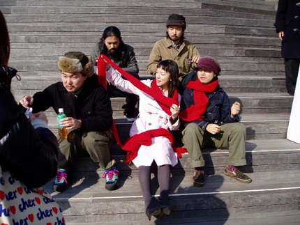 撮影が終了してもマフラーを巻いたままで、移動するスペアザ&KIKIさん。勢いで走り出した面々を、平間さんが急遽追いかけて撮影(笑)!