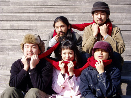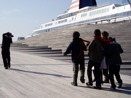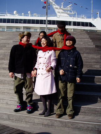 次は、一本の赤いマフラーを全員で巻くというシチュエーションに挑戦。スペアザに囲まれて「馴染んでいる」と平間さん&箭内さんから褒められてたKIKIさん(笑)。