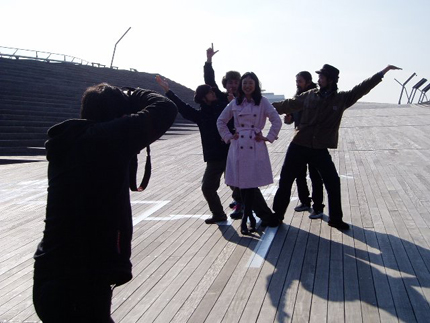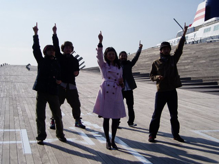 「飛鳥II」の前で佇む面々を撮影。ポラチェックのときも、仲良くマフラーを外さず……(笑)。