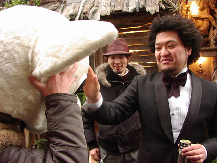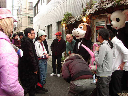 次は、お店の外へ移動。撮影の合間は、やはり着ぐるみが大人気☆ メンバー、スタッフで思わずかぶってしまう人が続出!?
