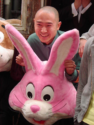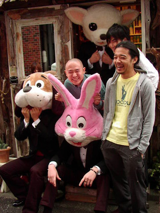 次のカットは、お店の前で撮影。cutman-boocheのベース・林さんが、ウサギの後ろで笑顔!! めちゃくちゃいい笑顔! 「やっぱりぬいぐるみと一緒だと、なんか和みますねぇ(笑)!」