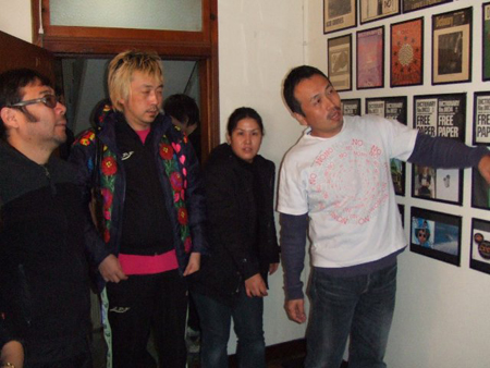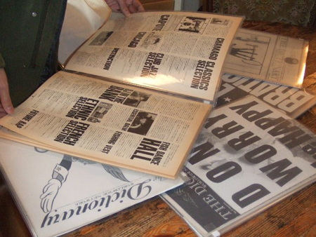 この日は都内の〈CLUB KING〉に集合。かつて寺山修司も住んだというレトロ・モダンな雰囲気が素敵な事務所です~。カメラマンの平間さん、ディレクターの箭内さんほかスタッフが見ているのが、壁一面に飾られた歴代のフリーペーパー「dictionary」の表紙デザイン! 今年でめでたく20周年を迎えた人気フリーペーパーの歴史が感じられます。机の上には、初期「dictionary」のファイルなども……。