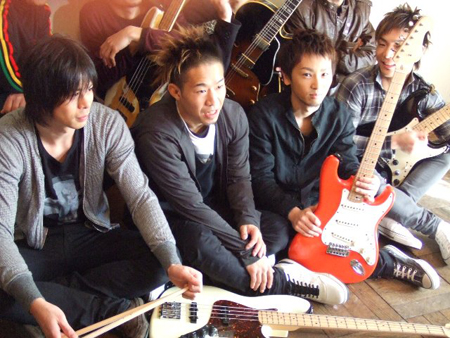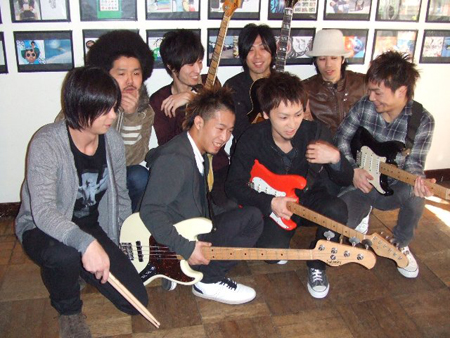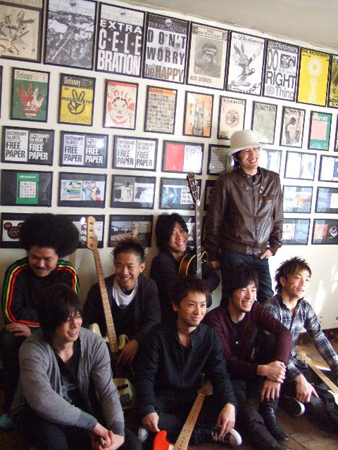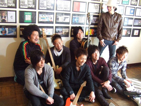 前列にUNCHAIN、後列にSCOOBIE DOが並び、自分の楽器を持って撮影することに。人数が多いので「なるべく密着して集まって」という撮影指示に、コヤマさんが「どーぞ、どーぞ。便器だと思って!」とUNCHAINのギター・佐藤さんにガッチリひざの間に入るように促し、笑いで緊張もほぐれます? さすが兄貴(笑)!